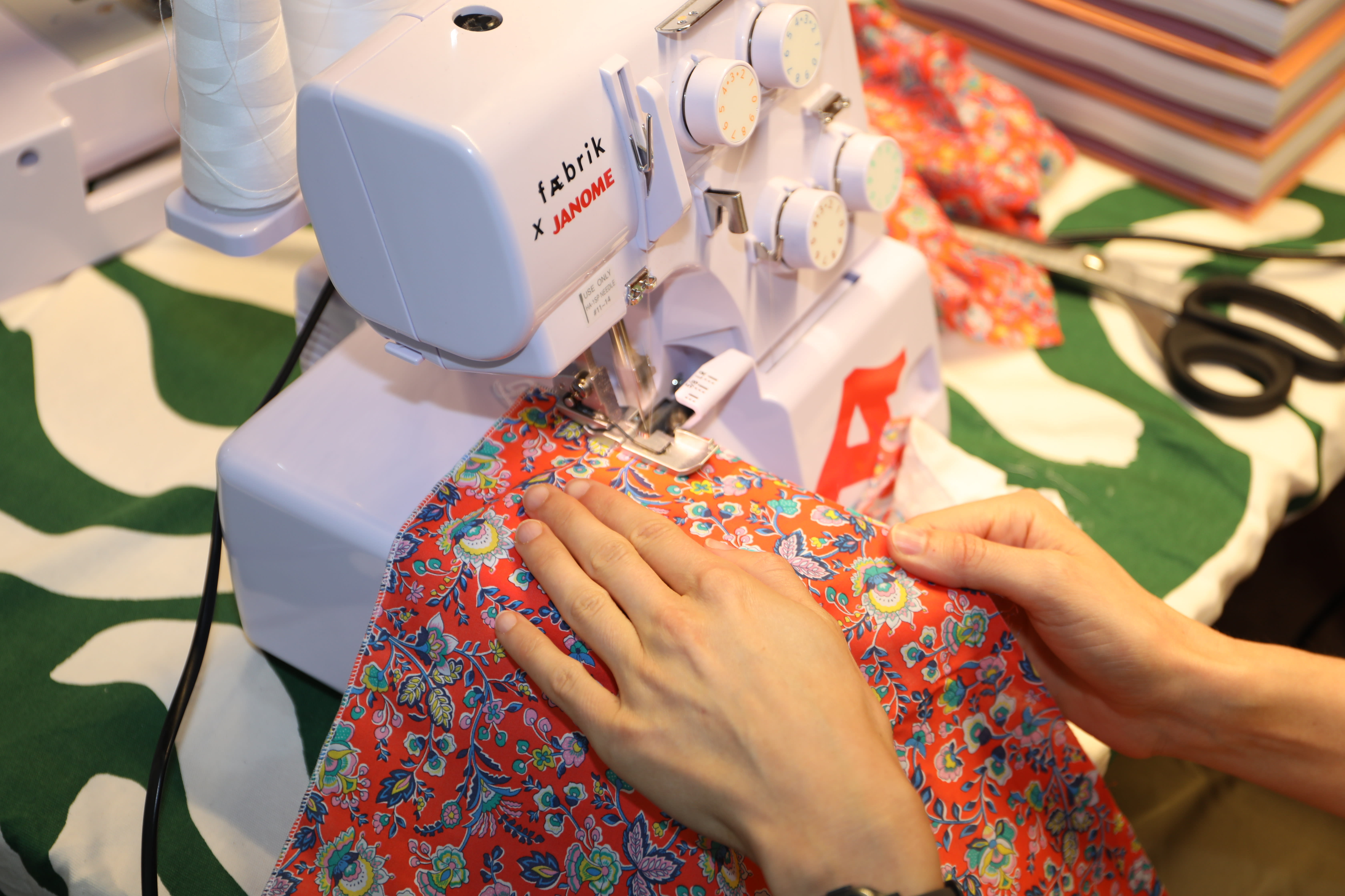 Så lages skautet med en overlocker-maskin som både kutter og syr på en gang.
