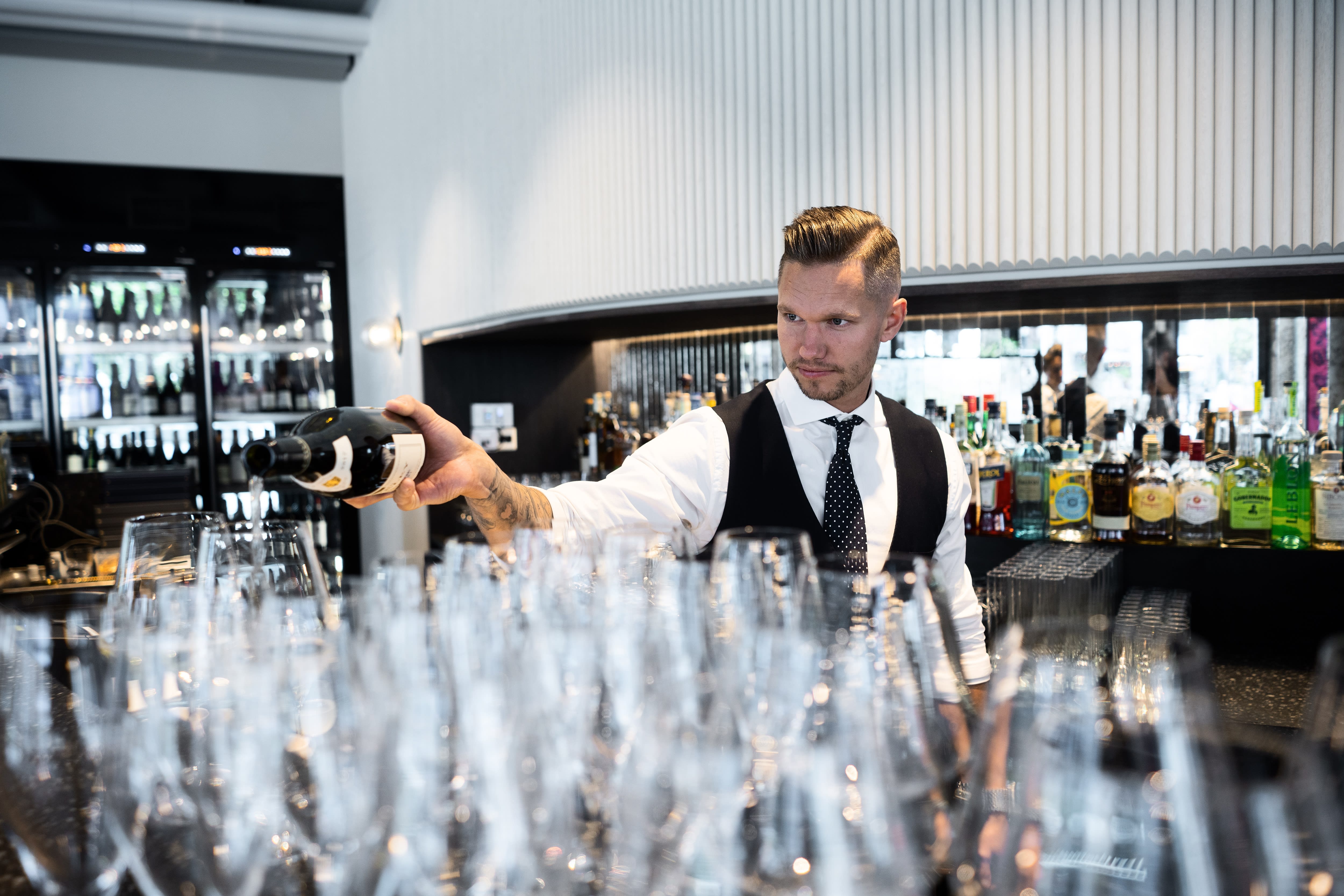 Man skjønner fort hvorfor. Her sitter store deler av finanseliten og skravler med servitørene. Mange av dem har tydeligvis vært her til lunsj og middag flere ganger allerede, så vi må pent vente i 20 minutter for å få bestilt noe.