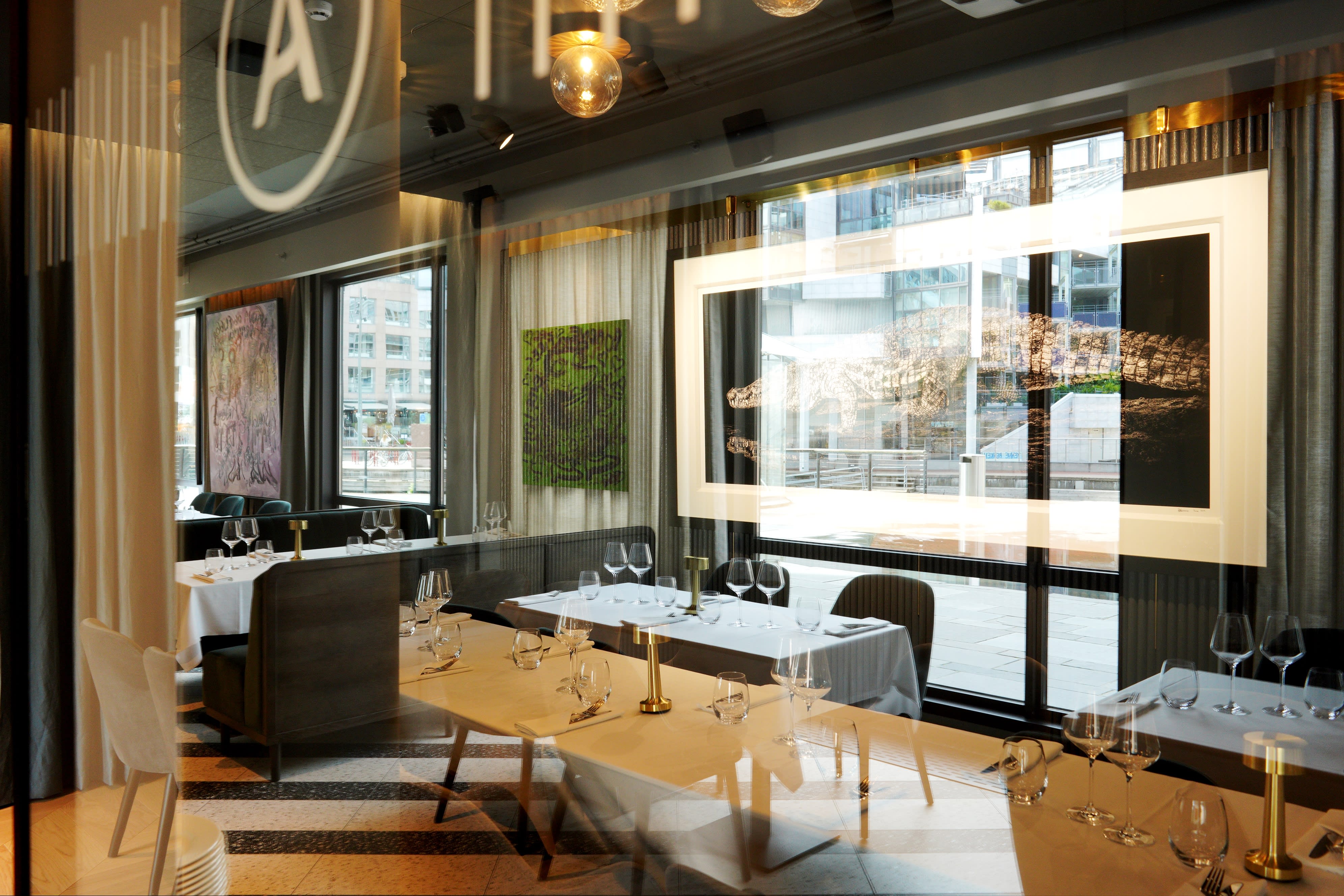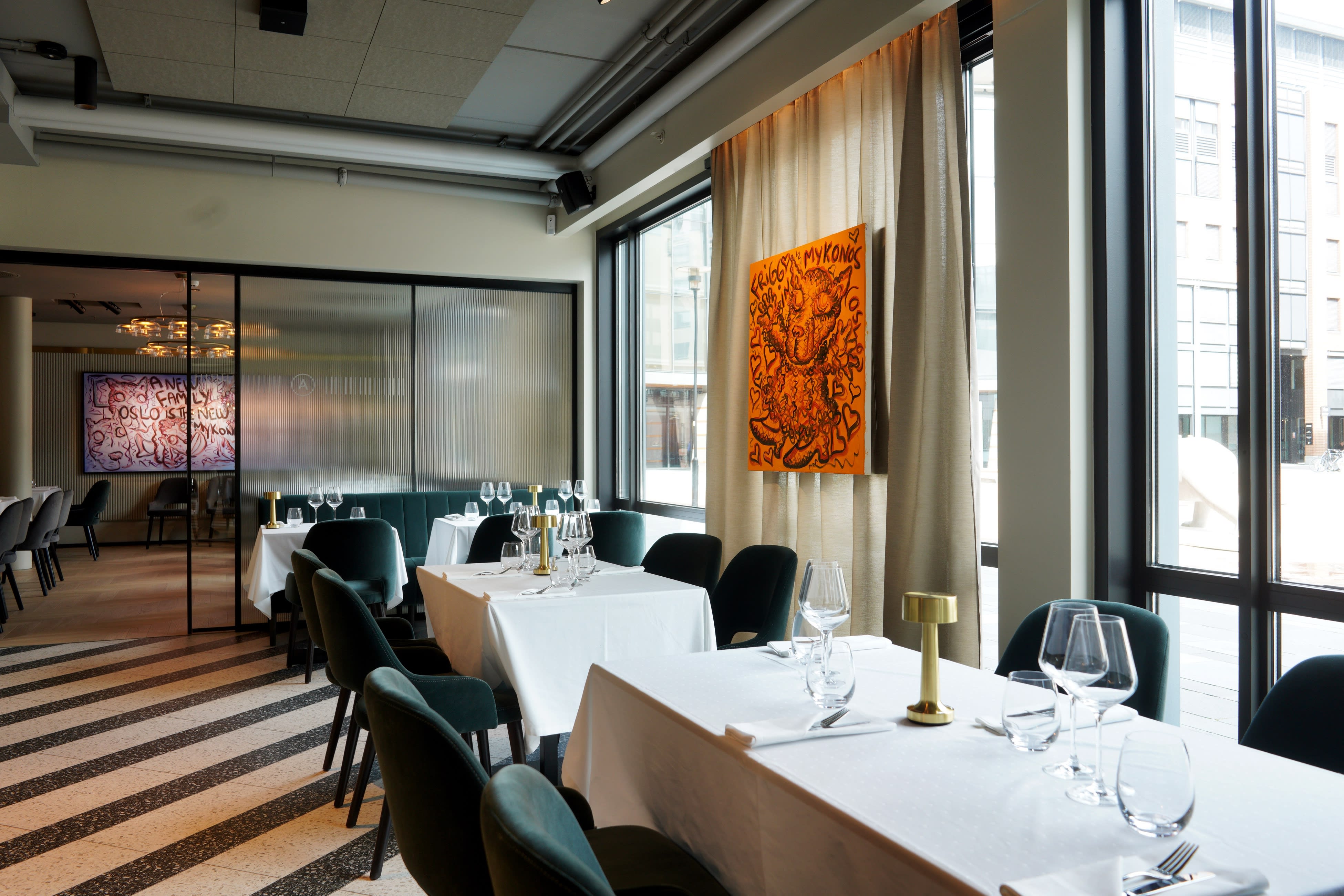 Det L-formede lokalet har mye flott kunst på veggene, masse Bjarne Melgaard, og er lyst og pent med vinduer langs sidene.