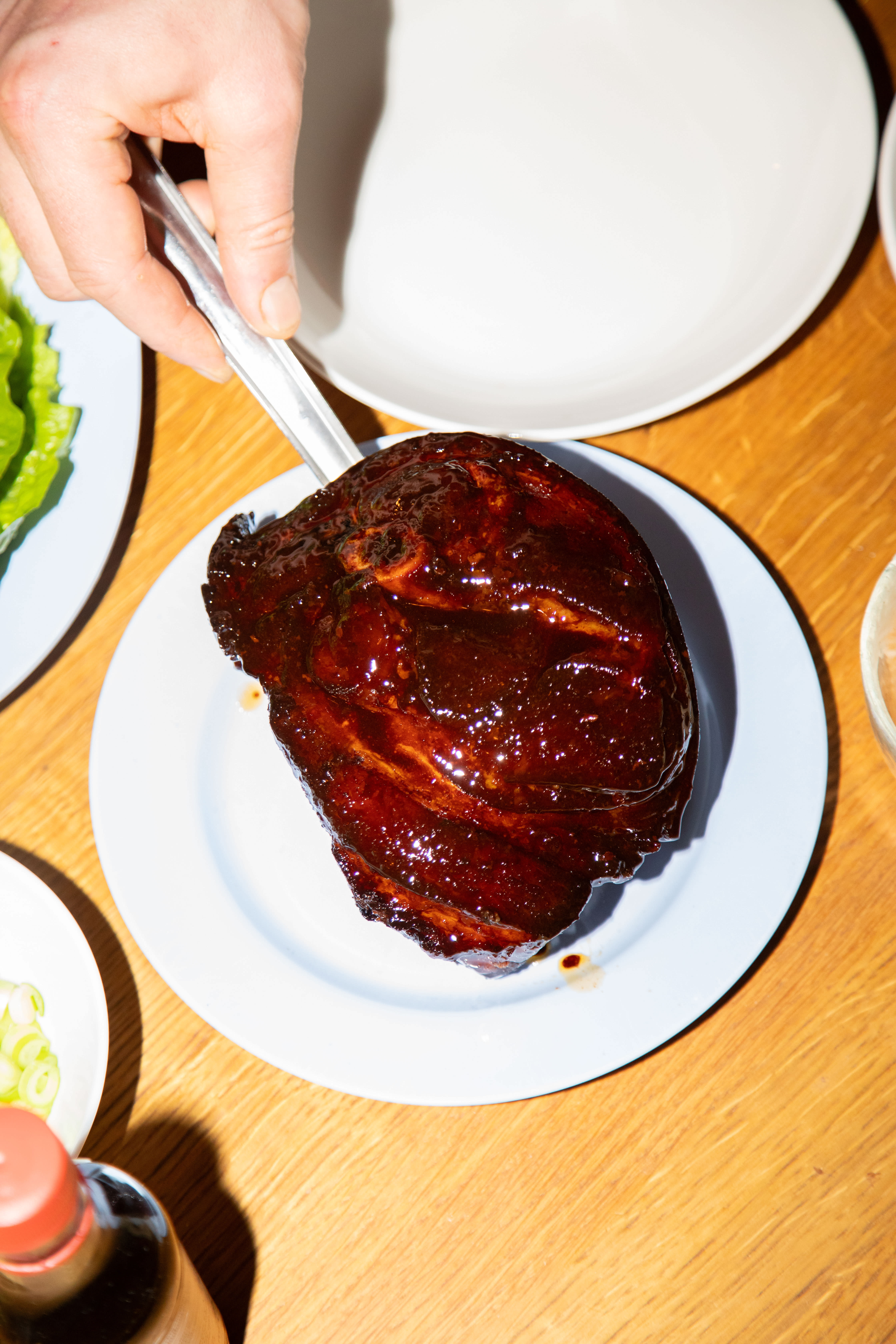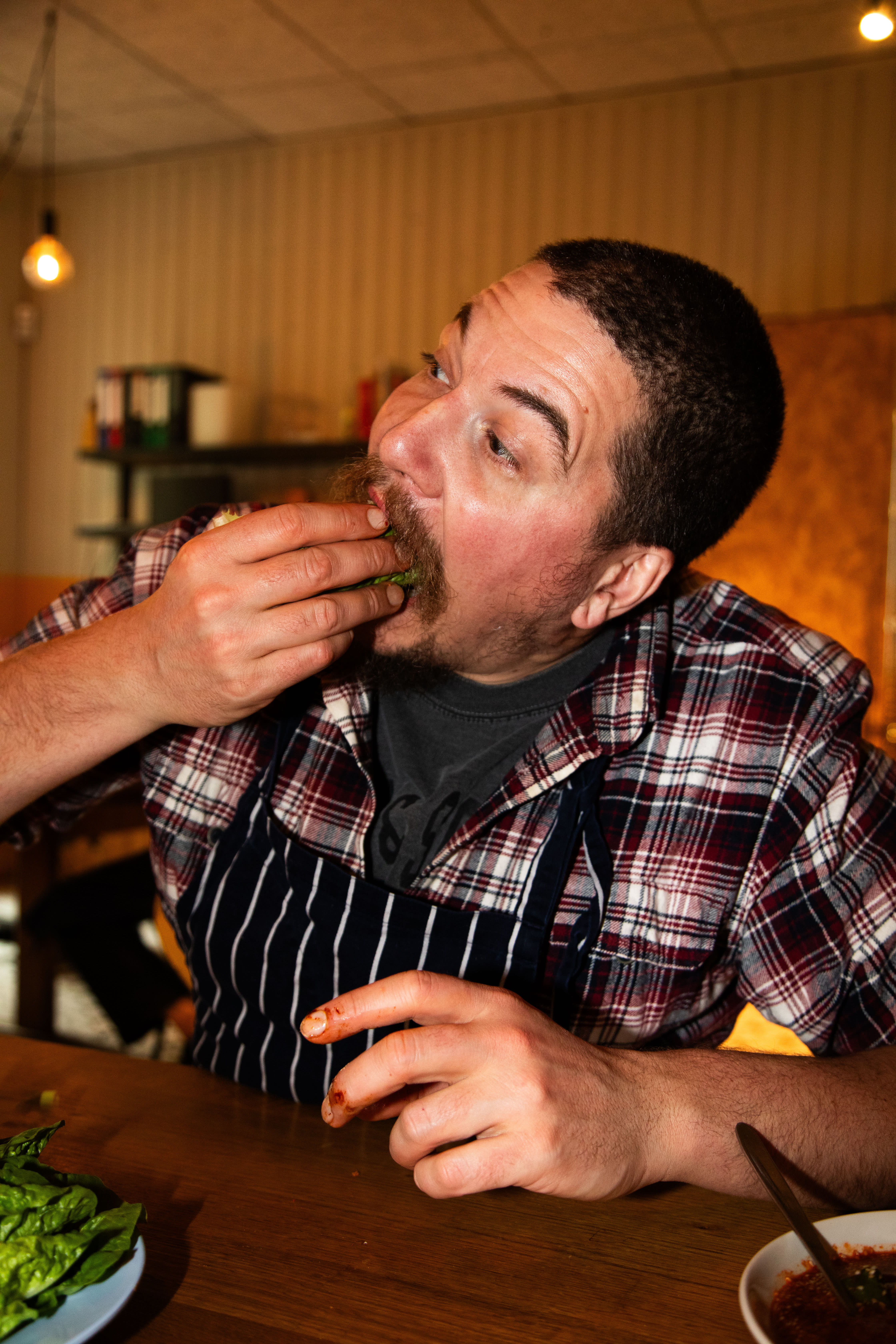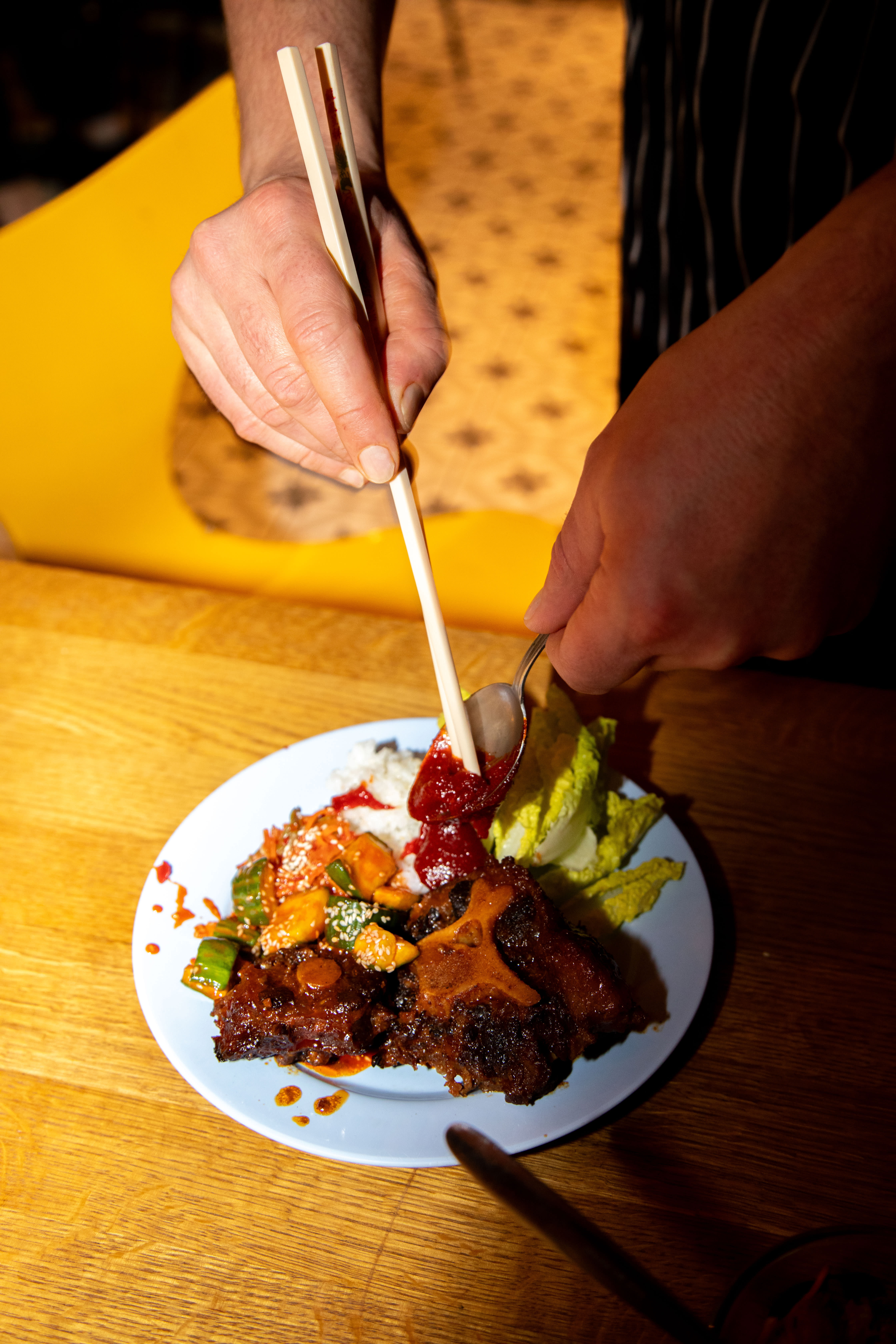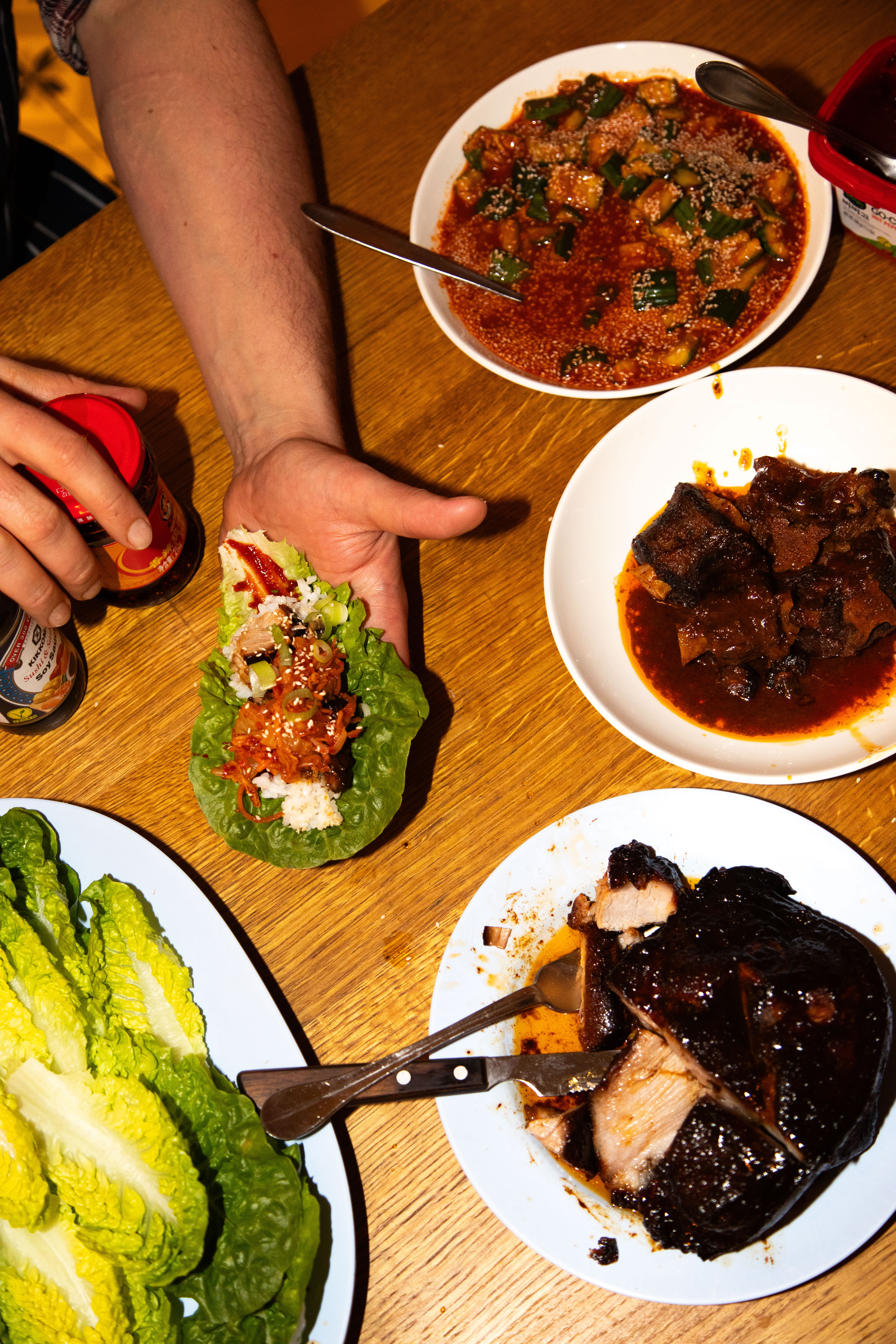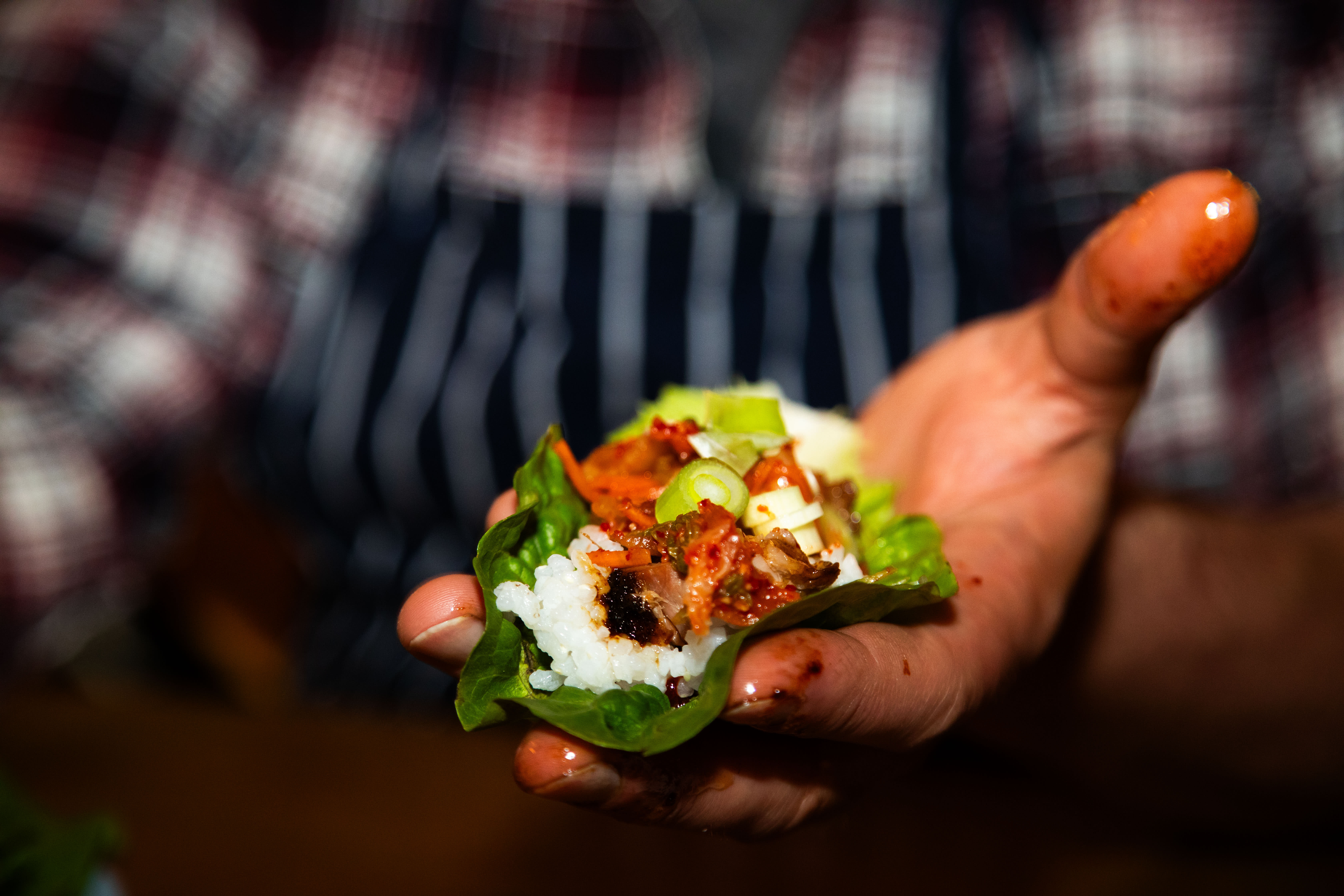 Inviter spisevennen din til bordet. Brett ut et salatblad, og bygg ssamen din. Smør litt gochujang i bunnen, legg på ris, kjøtt, agurksalat, kimchi og vårløk. Det skal være litt grisete.