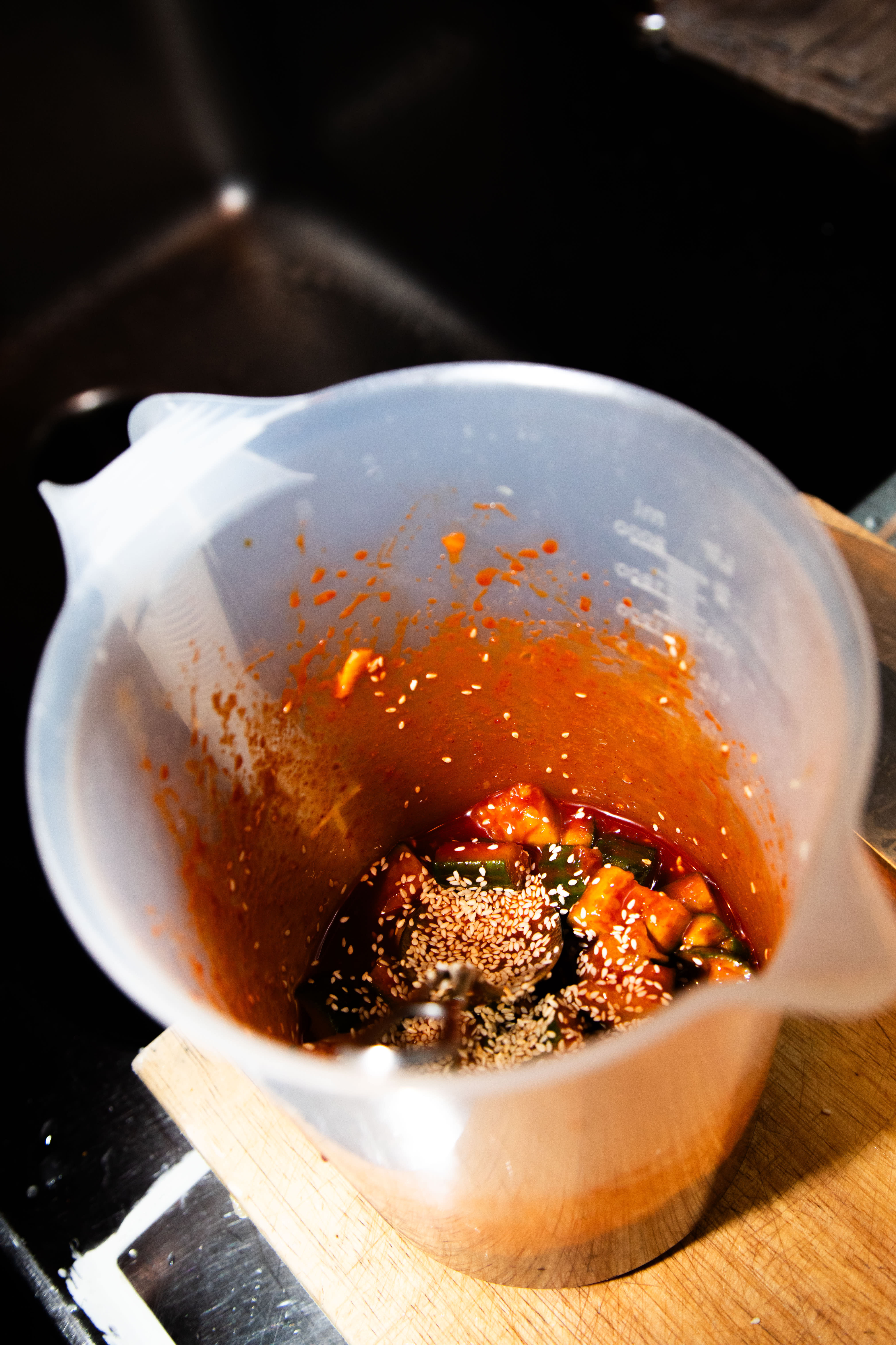 Så blandes bitene inn i en saus av gochujang, sojasaus, fiskesaus, brunt sukker og ristede sesamfrø. Smak til!