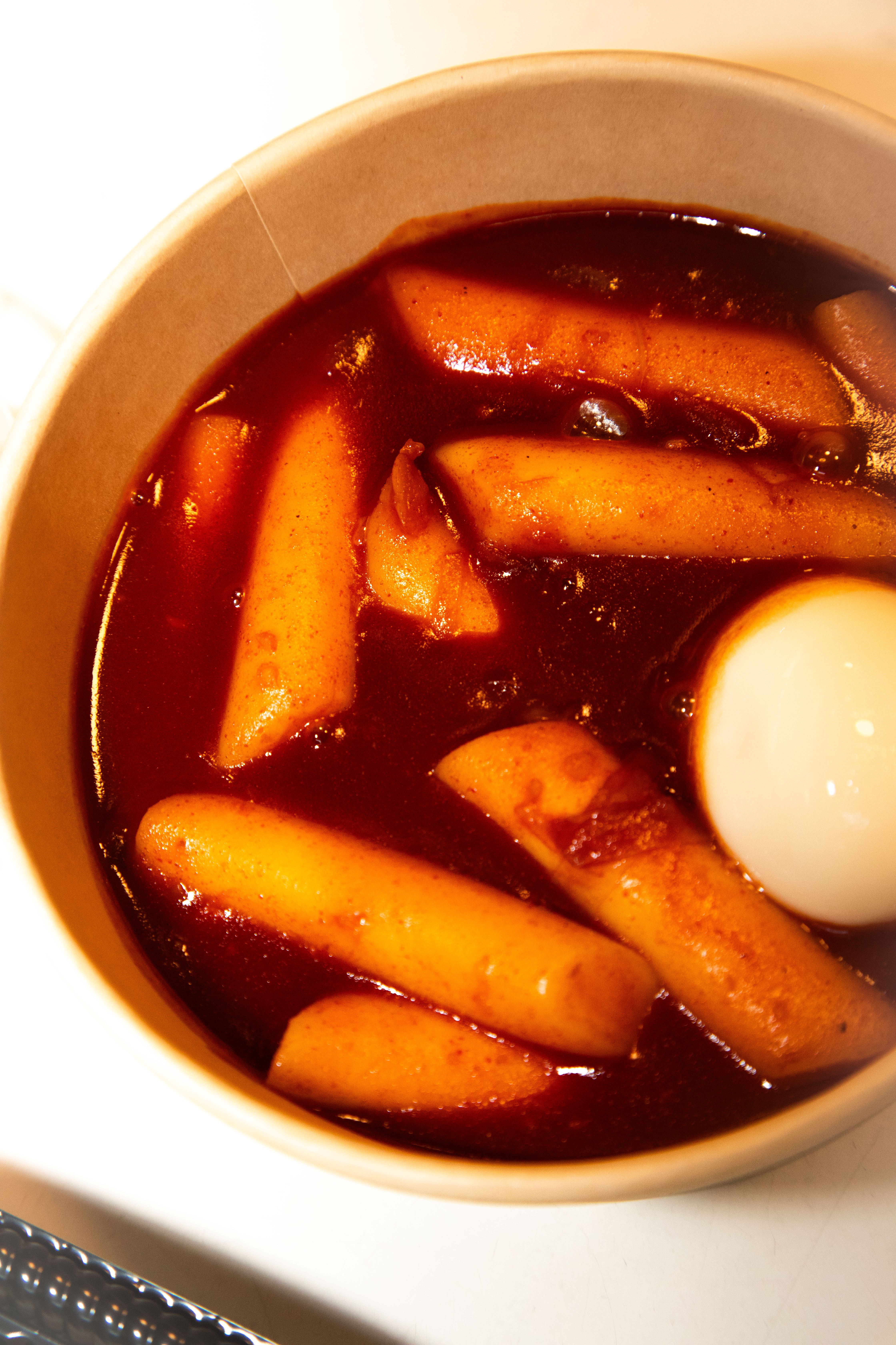 En bolle med tteokbokki settes frem. «Chewy» riskaker som bader i sterk gochujangsaus.