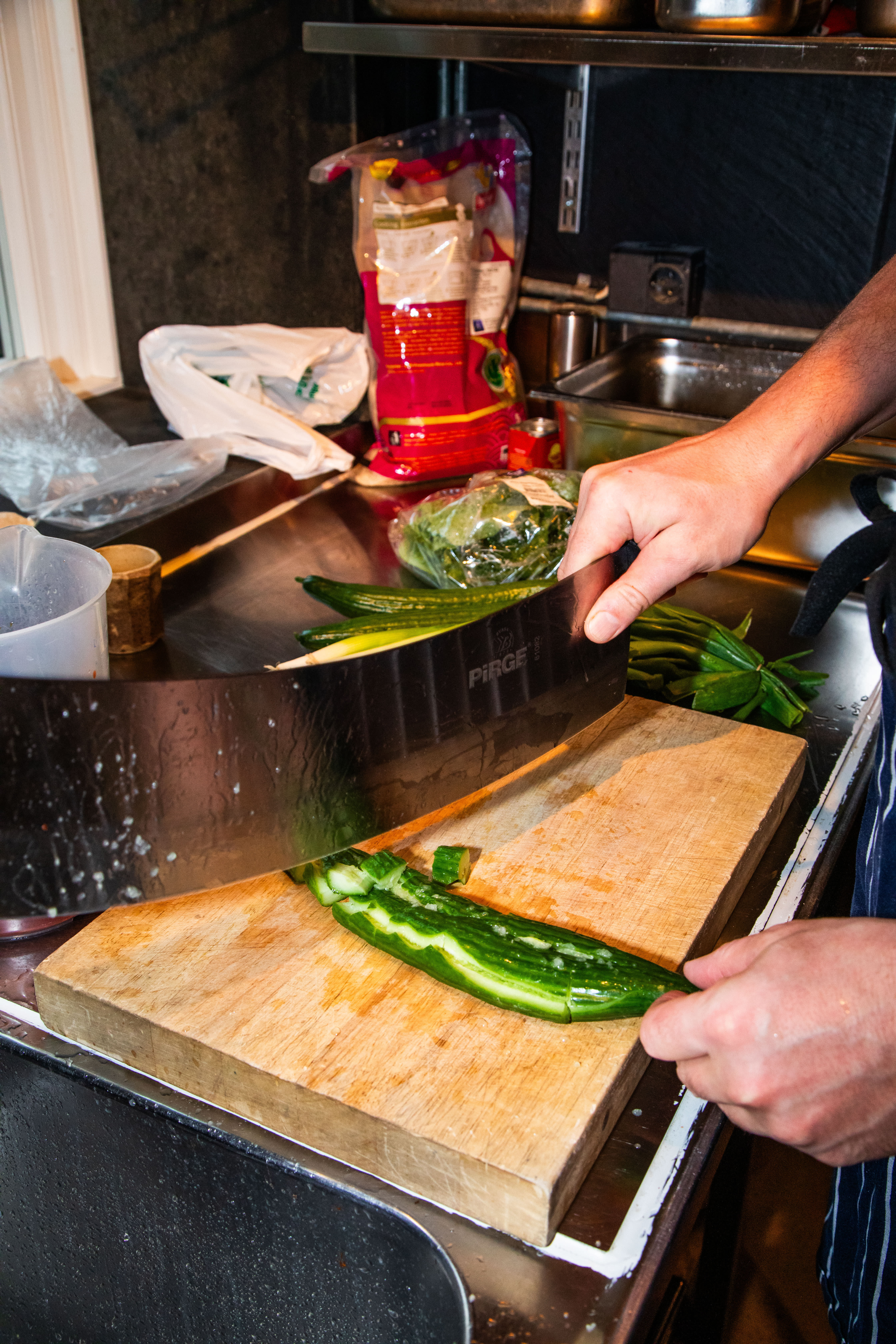 I mellomtiden lager du spicy agurksalat. Trikset her er å mose agurken før du kutter den i grove biter, ifølge Dardeau.