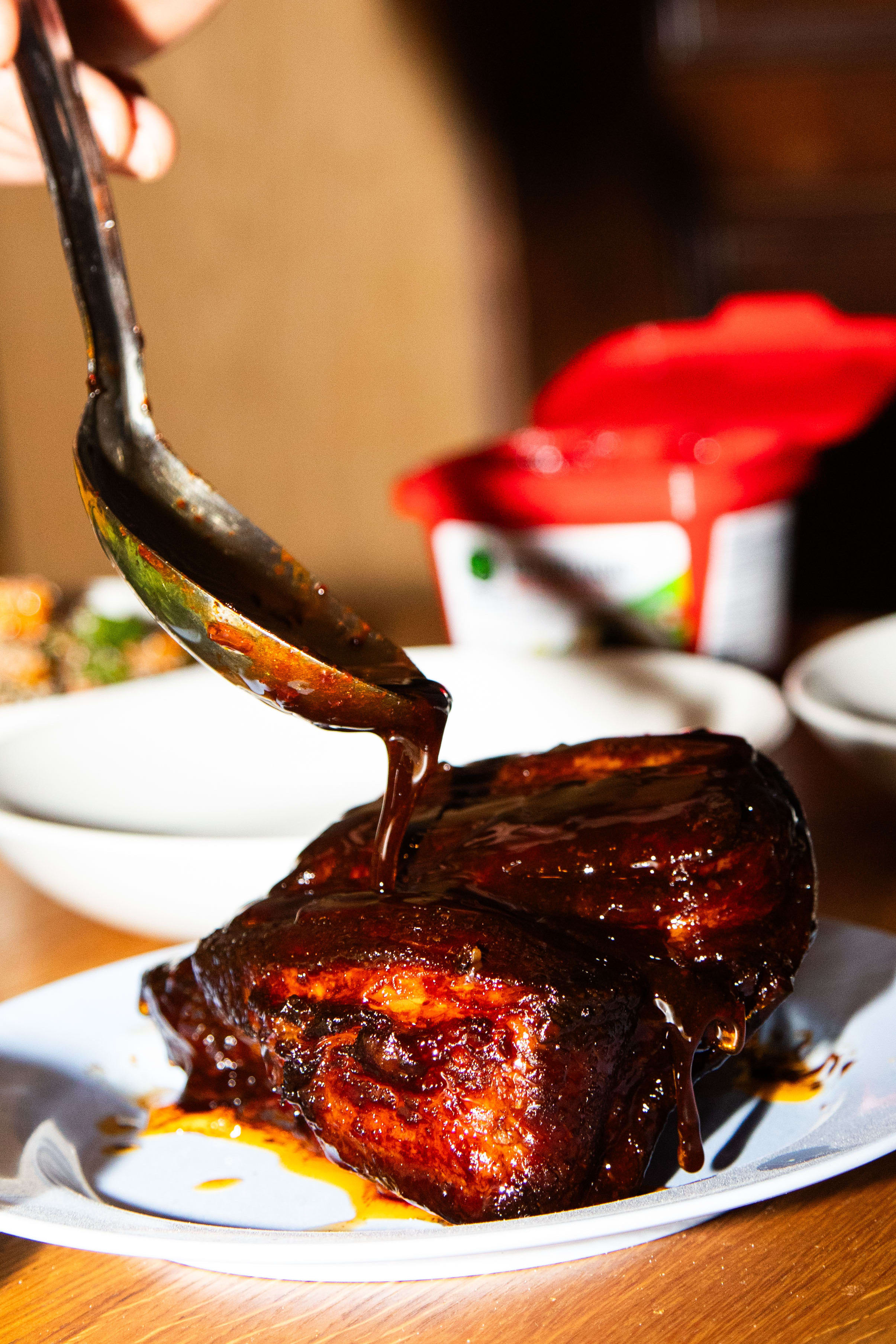 En svinebog tas ut av ovnen. Og ja! Glazen av gochujang, fiskesaus og brunt sukker er faktisk spinnvill.