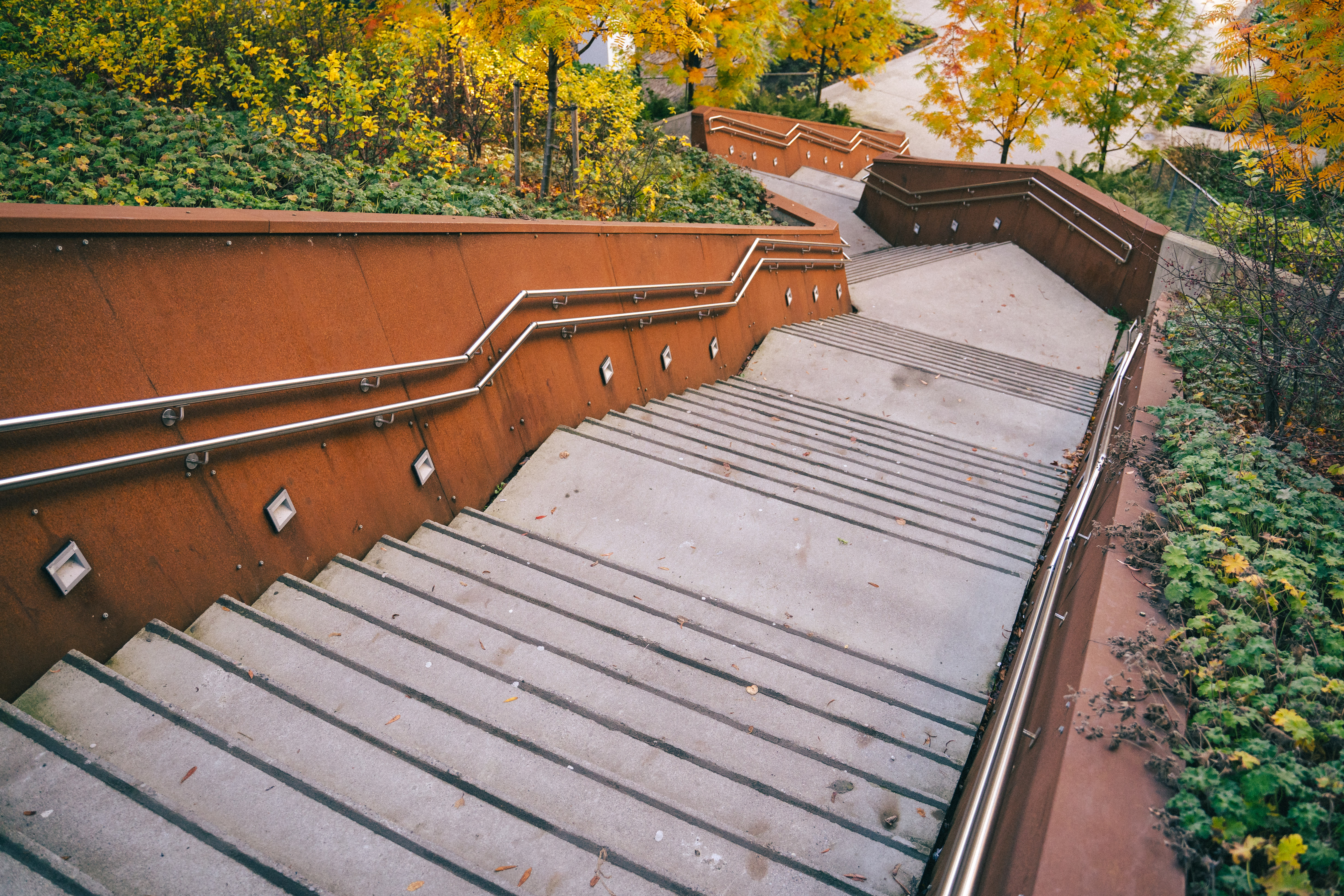 Metalltrapp i to seksjoner. Dype trinn i starten, her må man ta lange steg. Et stykke å dra for de aller fleste, men her er vi ved trappeløpernes eldorado.