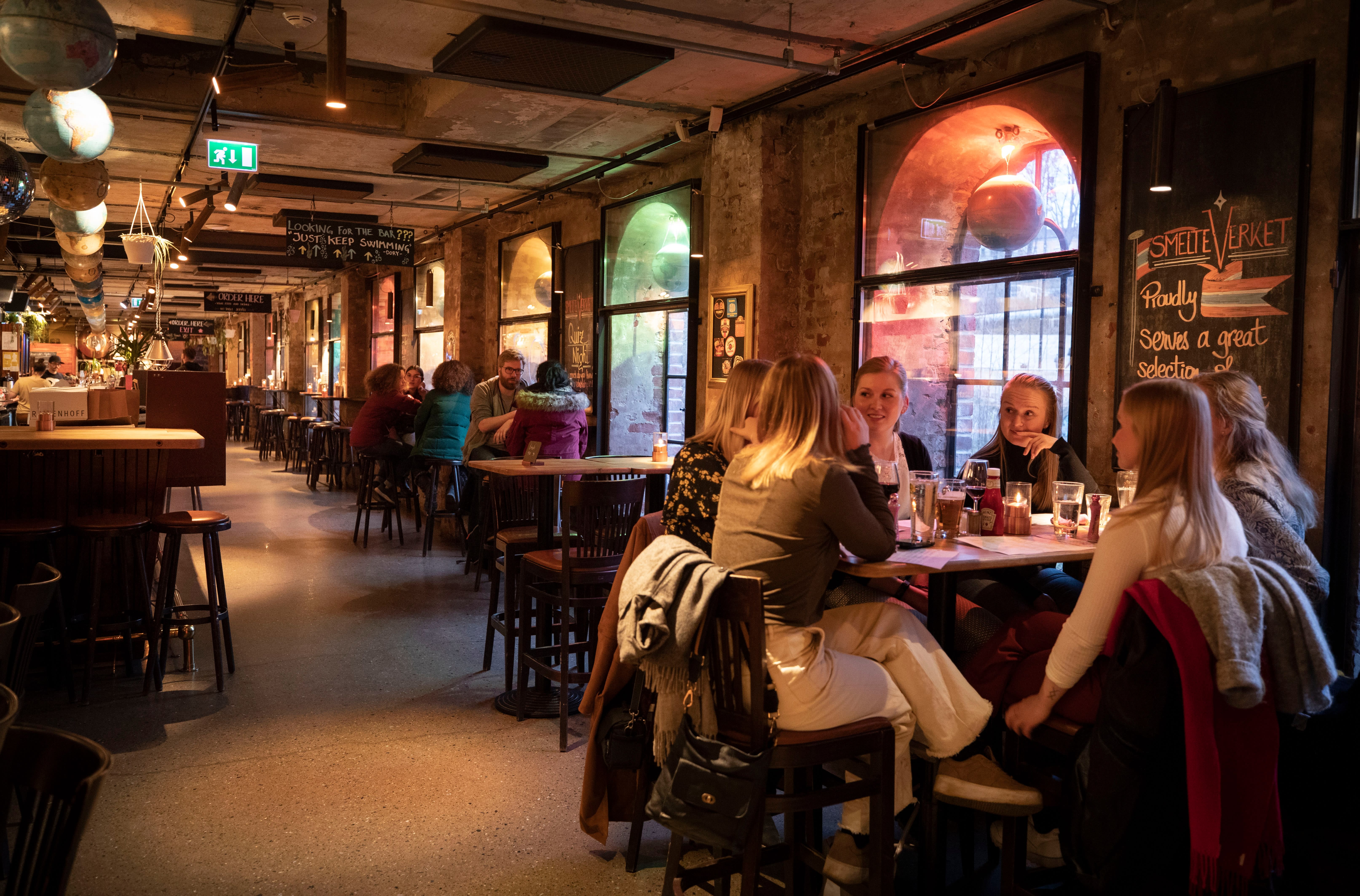 Det avlange lokalet har plass til mange gjester, og denne ettermiddagen er det så vidt vi klarer å presse oss sammen ved et bord. Det er flere store selskap som har benket seg langs veggen, og det har begynt å danne seg kø ved den 27 meter lange bardisken, som stedet hevder er Skandinavias lengste.