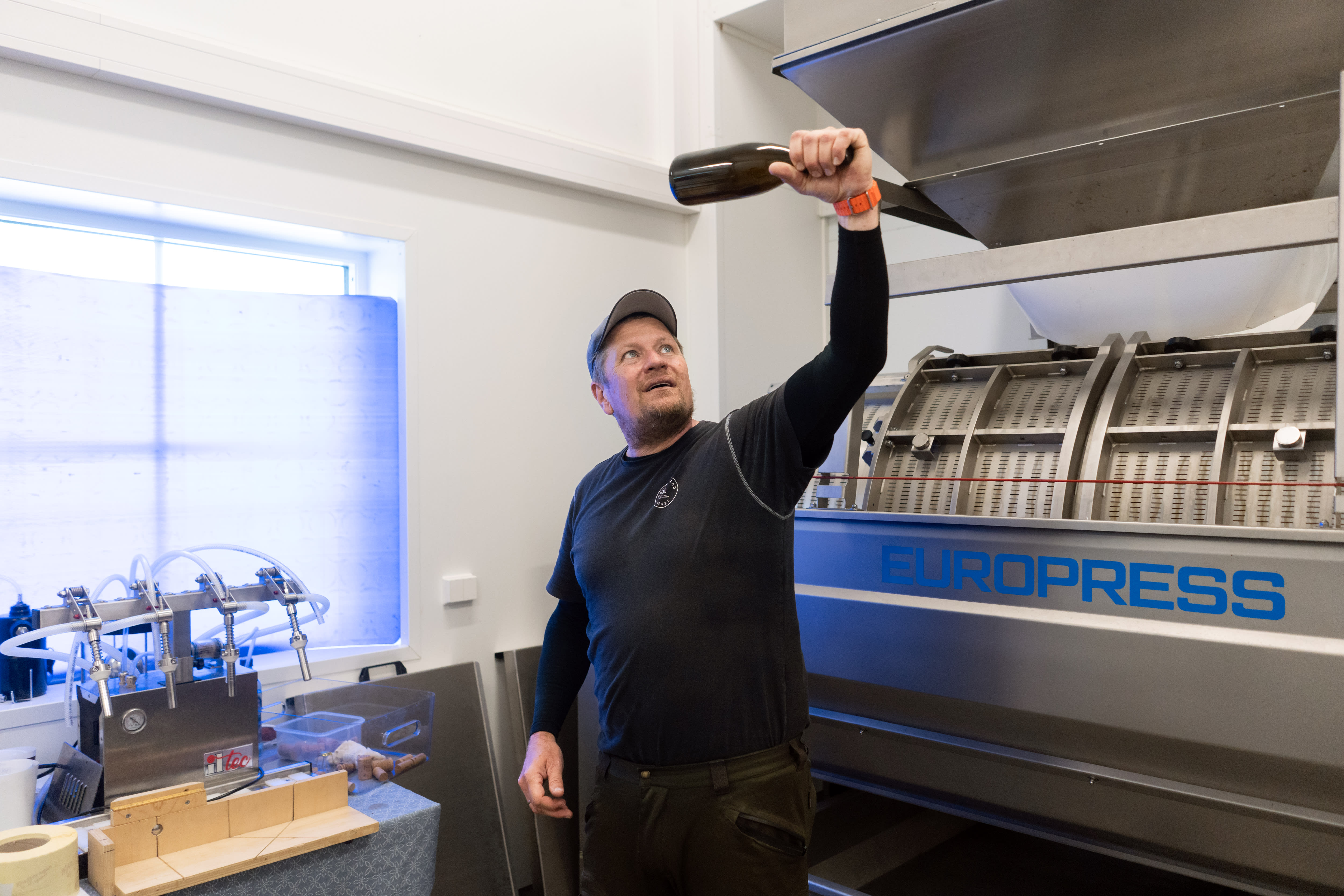 De har også gått til innkjøp av en høyteknologisk presse. Vinverdenen ble aldri det samme etter den kom, forteller han.