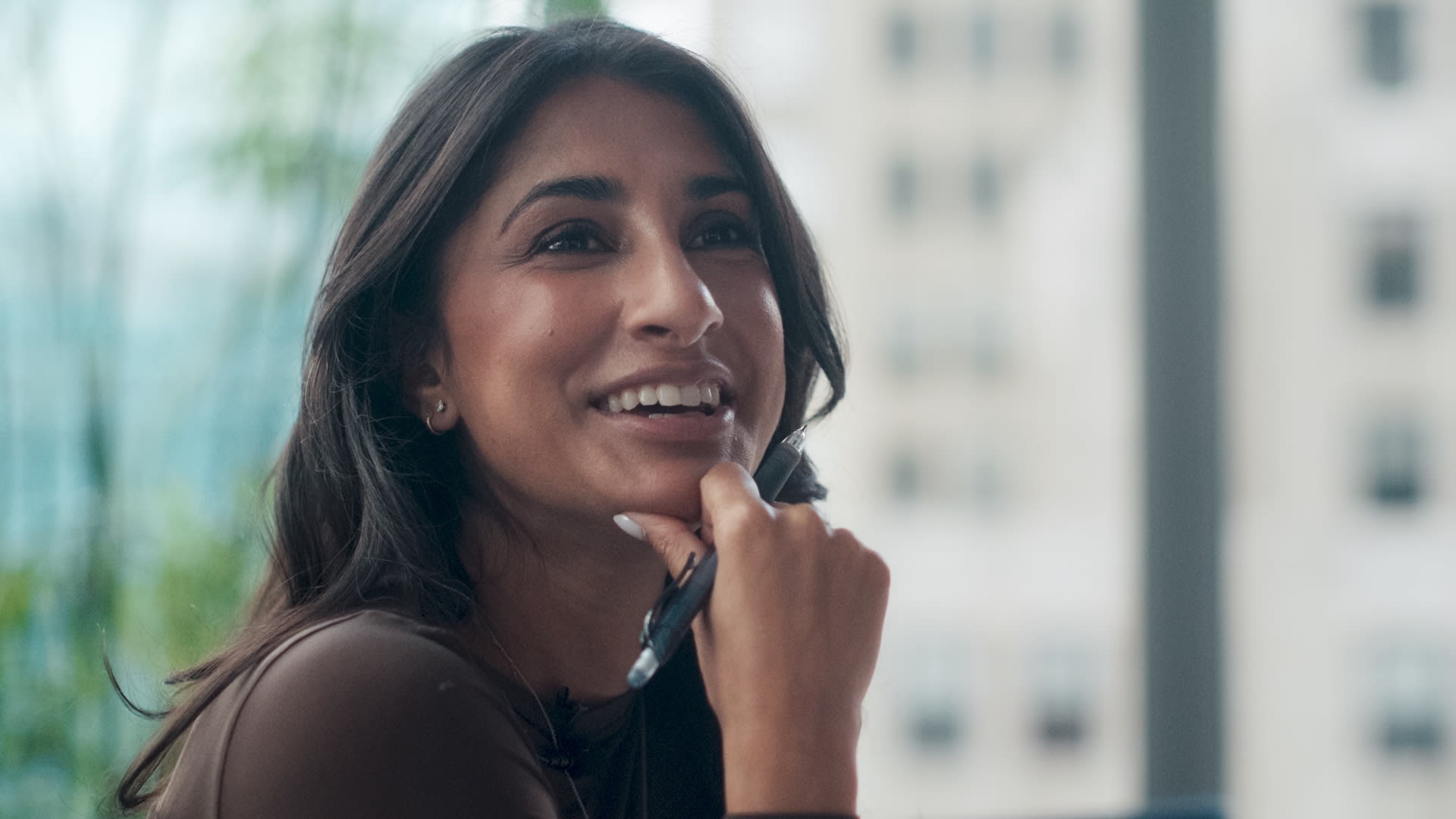 Fem av de ansatte i Oljefondet som serien følger. Fra venstre: Vaishali Lara Kathuria, Nicolai Tangen, Grete B. Starheim, Emil Framnes og Haakon Husøy. Foto: The Oslo Company/NRK