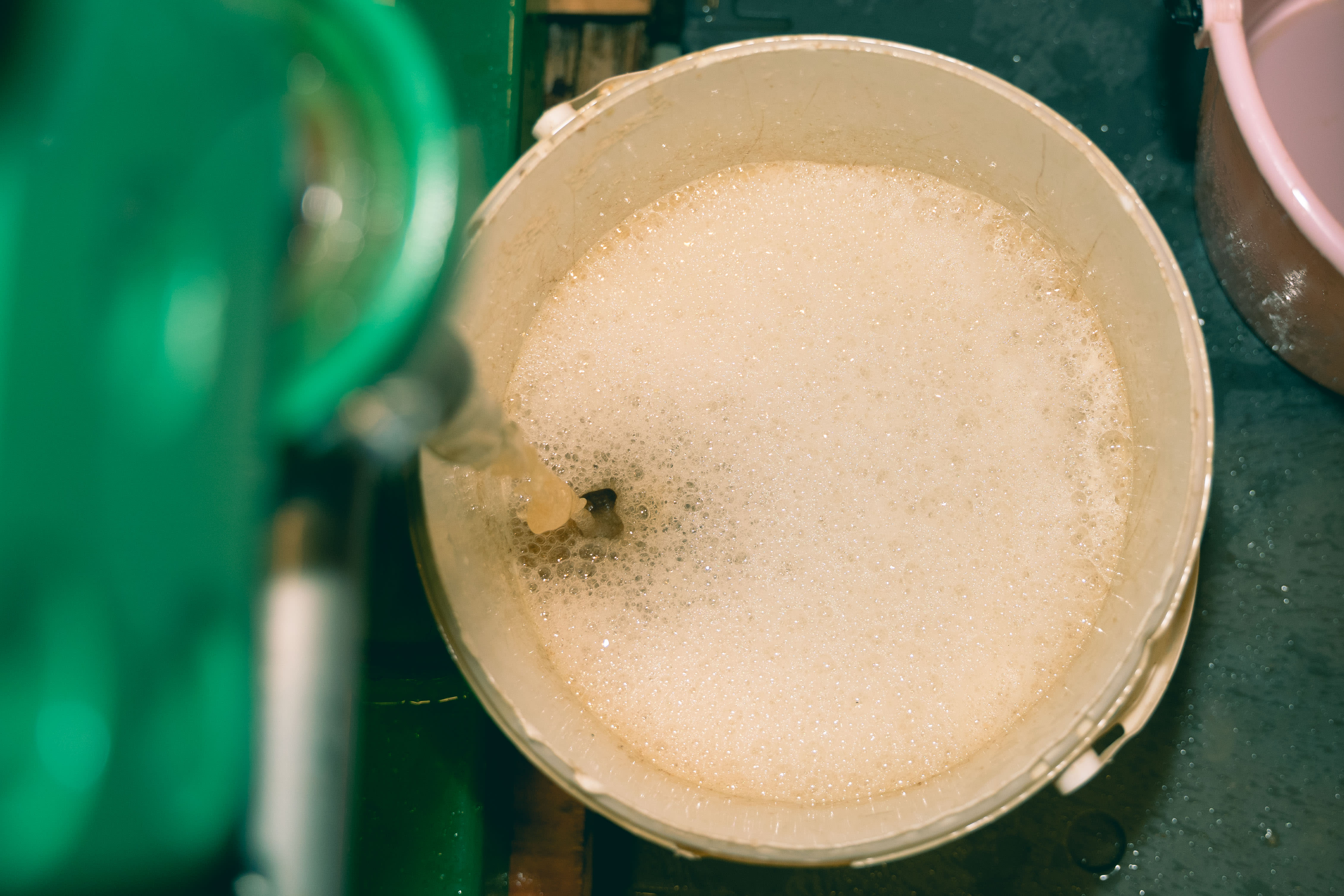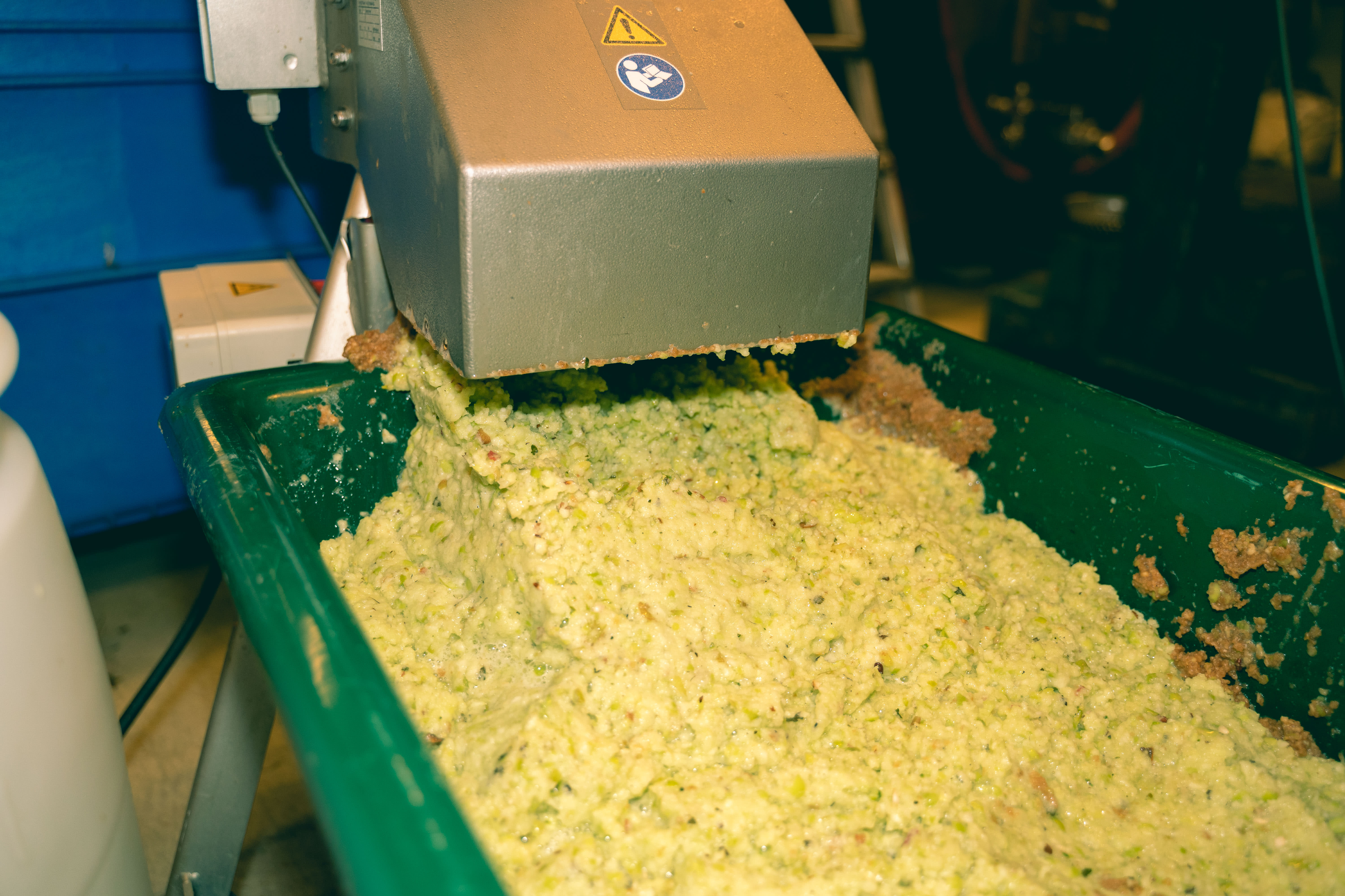 Nå skal det presses juice som skal tilsettes fruktsaft som allerede har stått og gjæret en stund.